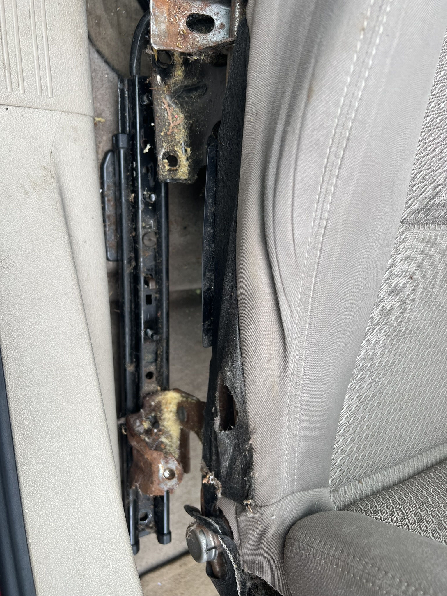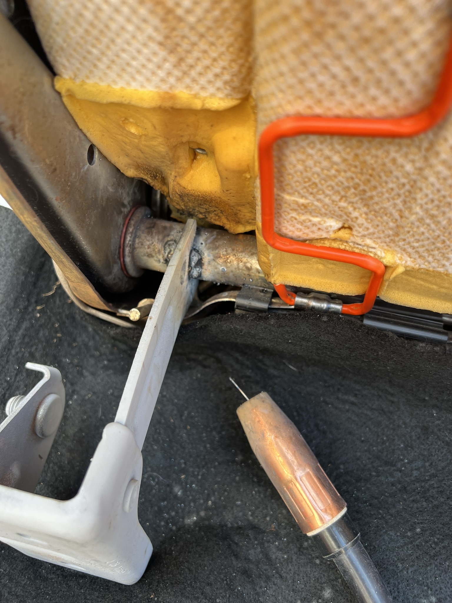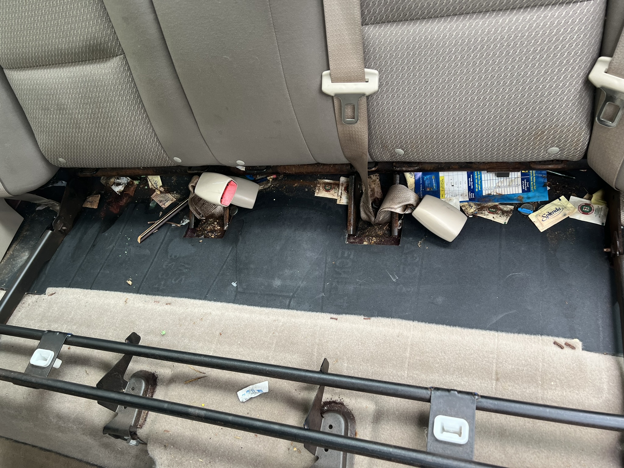 Seats had to come out, since there was a lot of mechanical cleanup required. Besides vacuum, hippie degreaser, hot water and steam were used. It was disgusting, a weaker stomach would hurl. All the rusty parts (seat rail spars, rear sear mount, etc.) were sprayed with a self-etching primer. Just the primer since this is a beater.