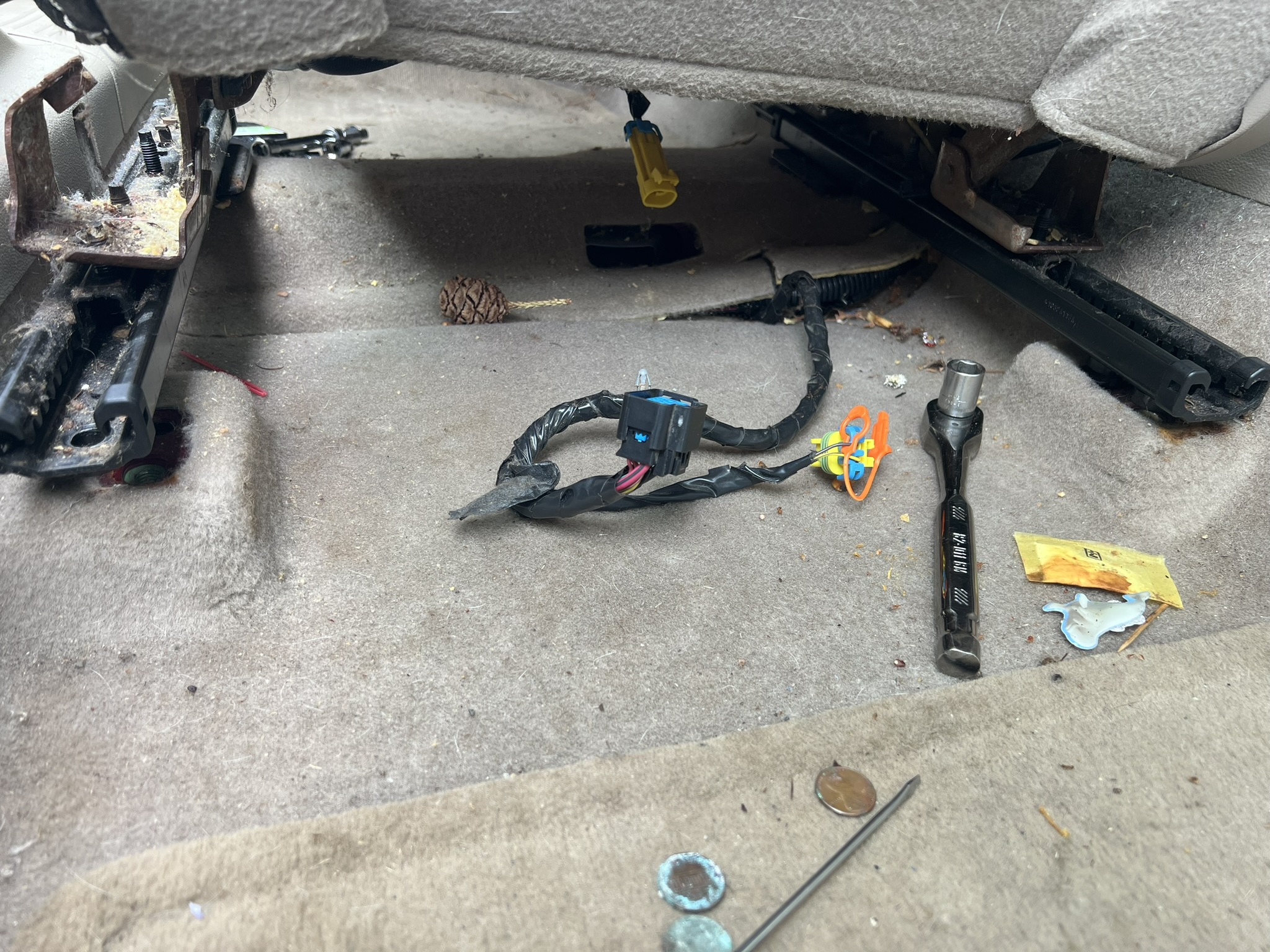 Seats had to come out, since there was a lot of mechanical cleanup required. Besides vacuum, hippie degreaser, hot water and steam were used. It was disgusting, a weaker stomach would hurl. All the rusty parts (seat rail spars, rear sear mount, etc.) were sprayed with a self-etching primer. Just the primer since this is a beater.
